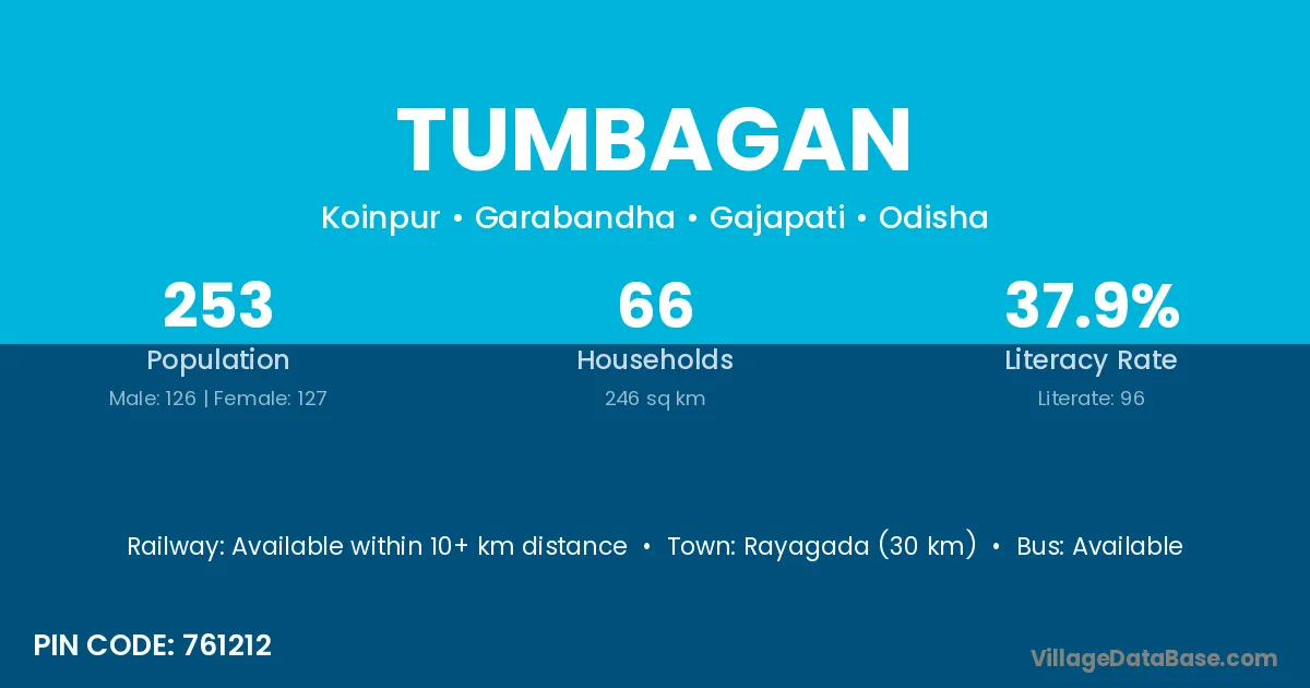 Rayagada (30 km) is the nearest town to Tumbagan village for major economic activities and is located approximately 30 km away.