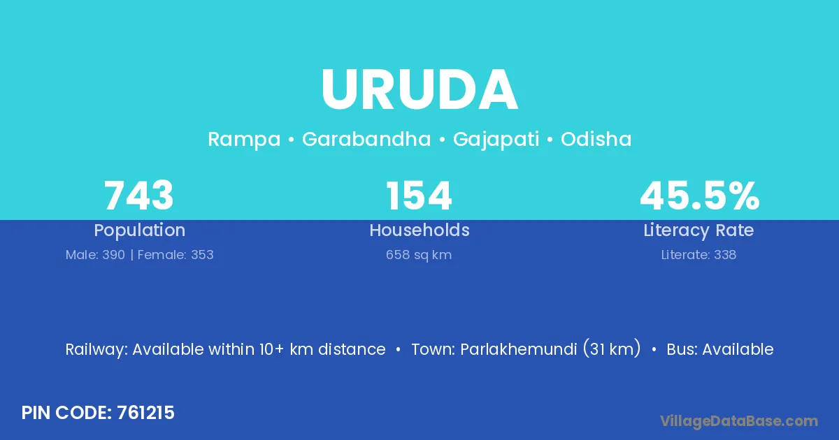 Parlakhemundi (31 km) is the nearest town to Uruda village for major economic activities and is located approximately 31 km away.