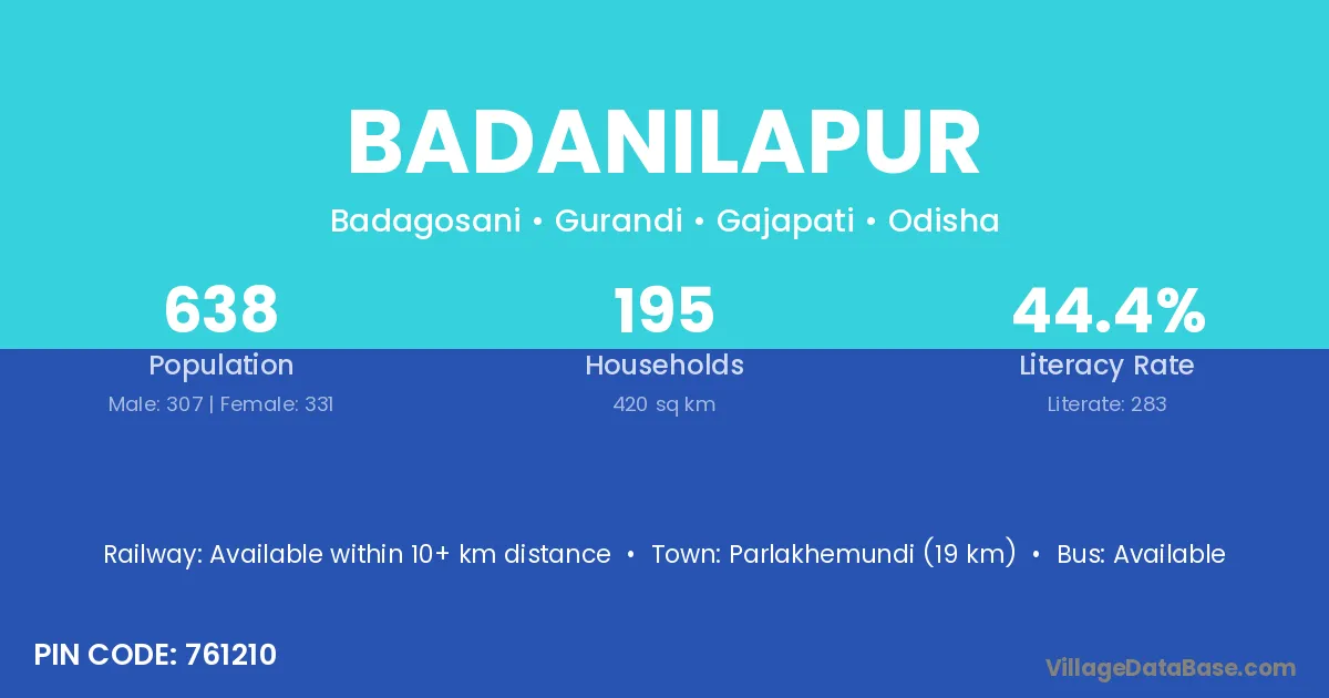 Parlakhemundi (19 km) is the nearest town to Badanilapur village for major economic activities and is located approximately 19 km away.