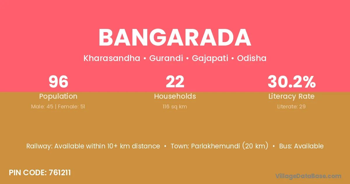 Parlakhemundi (20 km) is the nearest town to Bangarada village for major economic activities and is located approximately 20 km away.