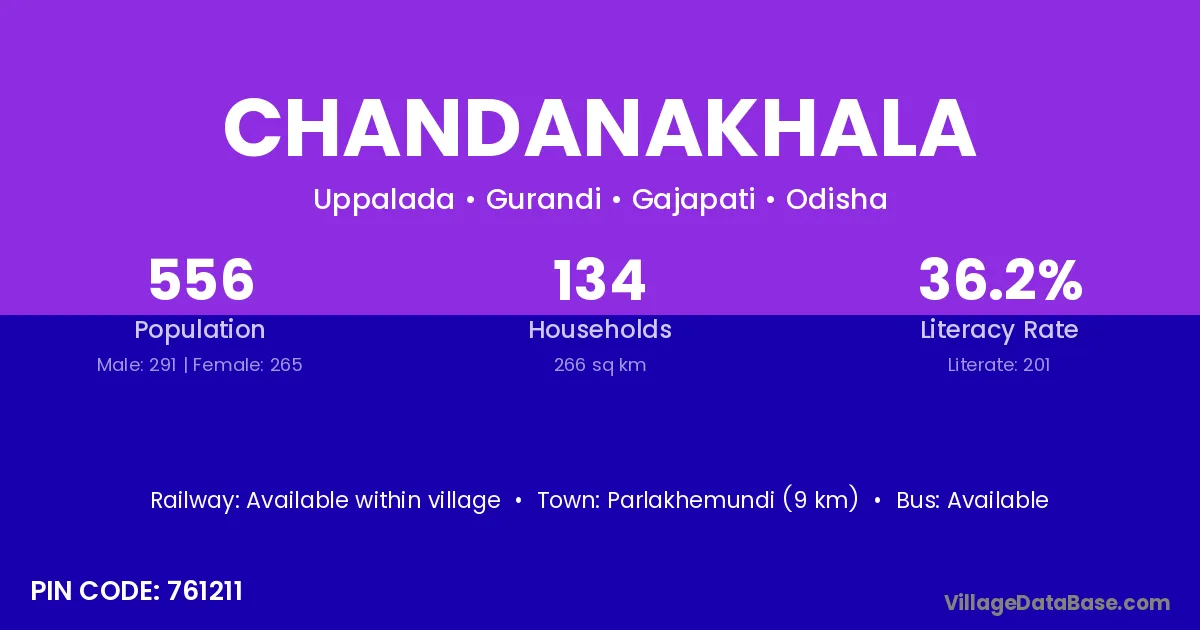 Chandanakhala village has a total population of 556 people, of which 291 are males and 265 are females.