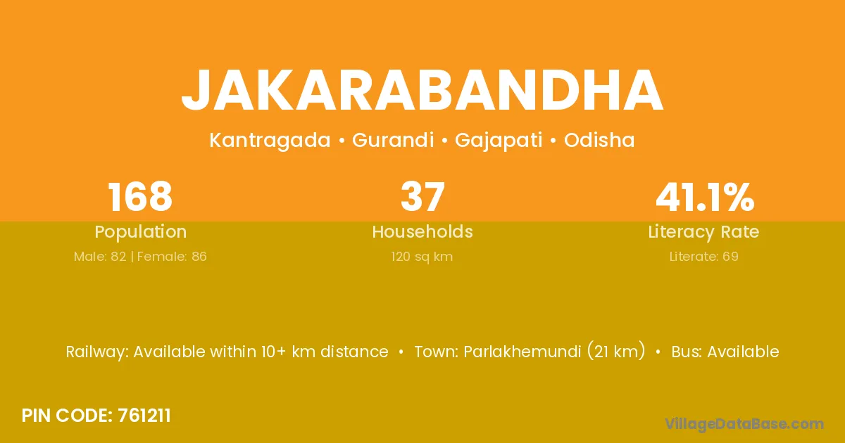 Parlakhemundi (21 km) is the nearest town to Jakarabandha village for major economic activities and is located approximately 21 km away.