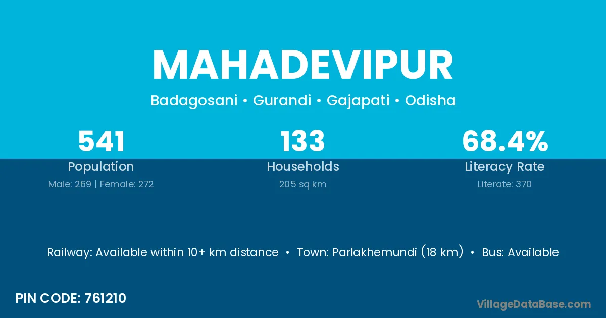 Parlakhemundi (18 km) is the nearest town to Mahadevipur village for major economic activities and is located approximately 18 km away.