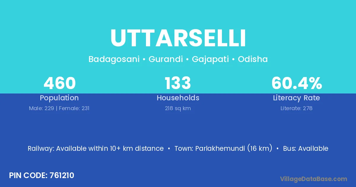 Parlakhemundi (16 km) is the nearest town to Uttarselli village for major economic activities and is located approximately 16 km away.