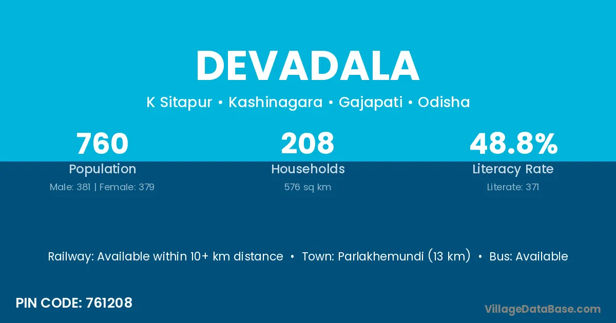 Parlakhemundi (13 km) is the nearest town to Devadala village for major economic activities and is located approximately 13 km away.