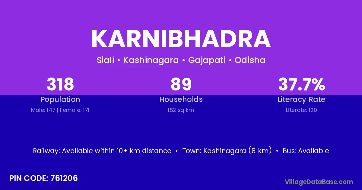 Kashinagara (8 km) is the nearest town to Karnibhadra village for major economic activities and is located approximately 8 km away.