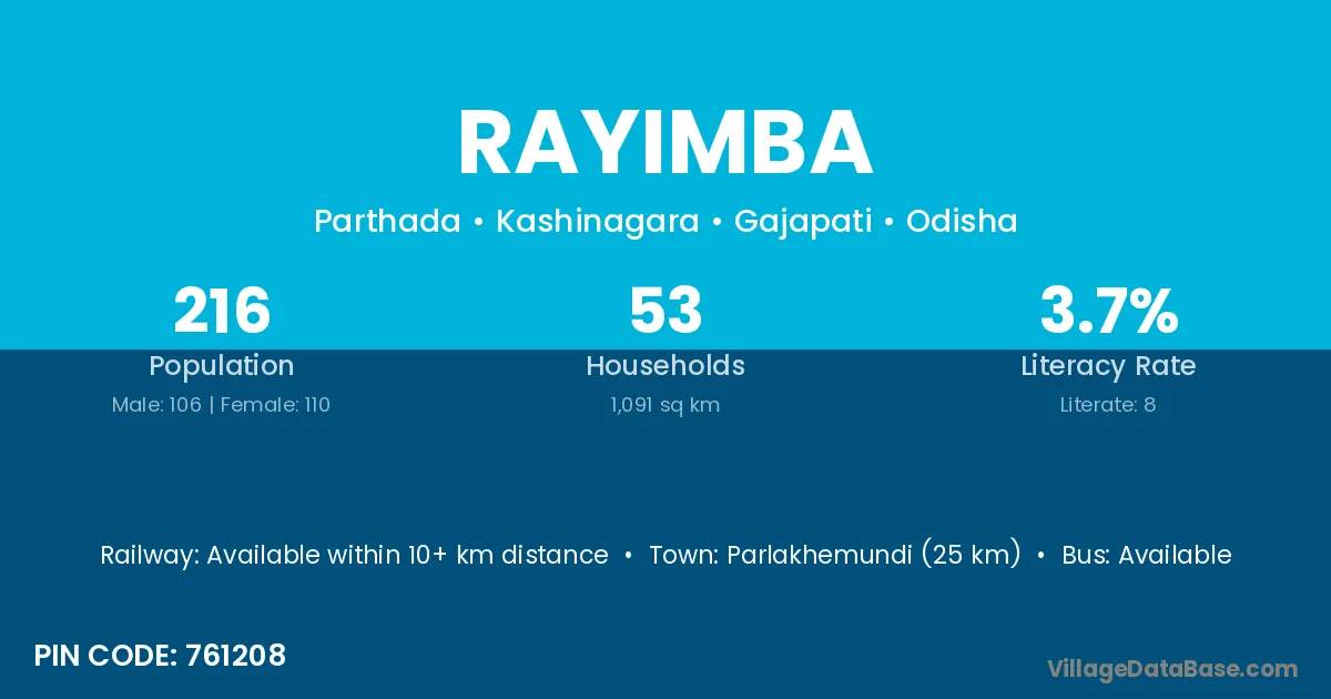 Parlakhemundi (25 km) is the nearest town to Rayimba village for major economic activities and is located approximately 25 km away.