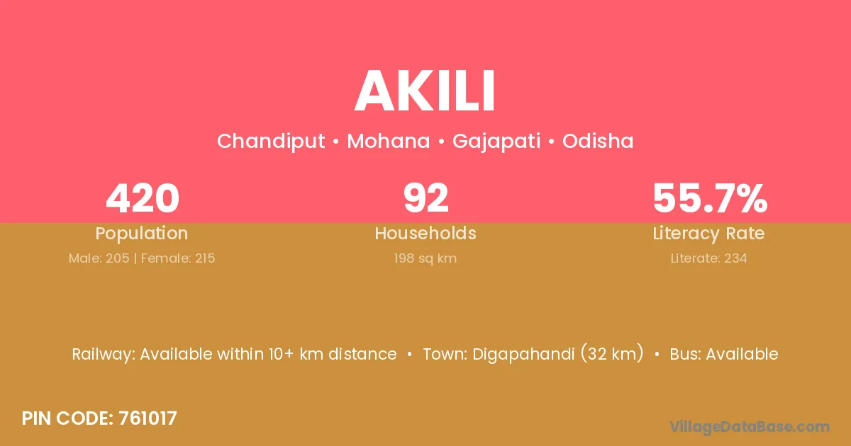 Digapahandi (32 km) is the nearest town to Akili village for major economic activities and is located approximately 32 km away.