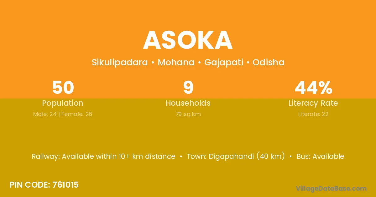 Digapahandi (40 km) is the nearest town to Asoka village for major economic activities and is located approximately 40 km away.