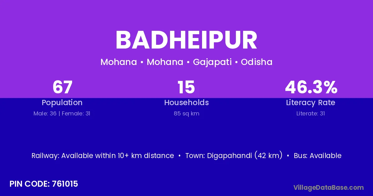 Digapahandi (42 km) is the nearest town to Badheipur village for major economic activities and is located approximately 42 km away.