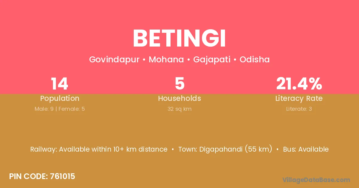 Digapahandi (55 km) is the nearest town to Betingi village for major economic activities and is located approximately 55 km away.