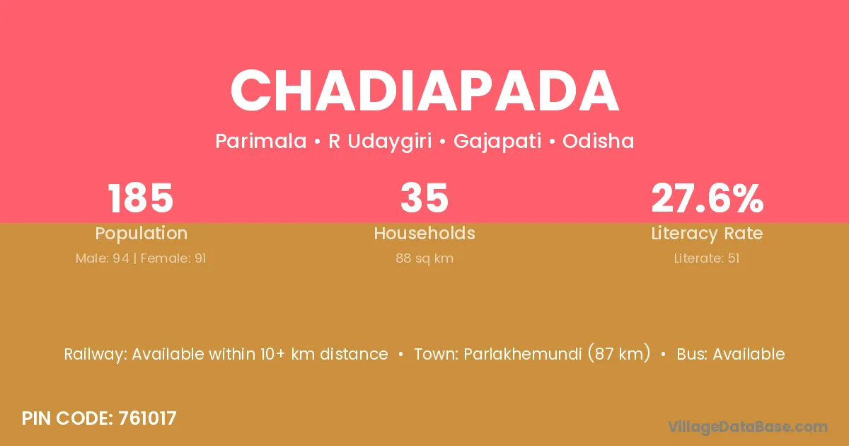 Digapahandi (51 km) is the nearest town to Chadiapada village for major economic activities and is located approximately 51 km away.