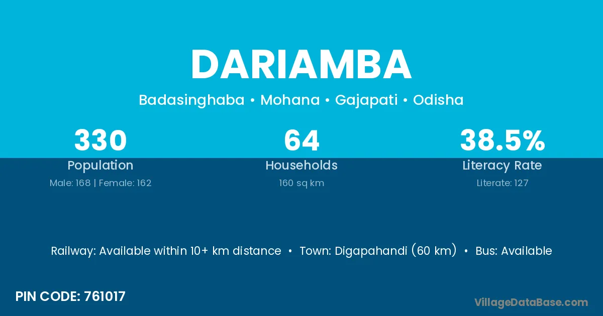 Digapahandi (60 km) is the nearest town to Dariamba village for major economic activities and is located approximately 60 km away.