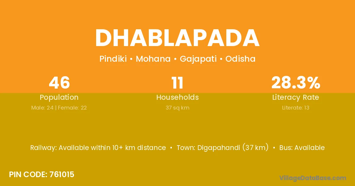 Digapahandi (37 km) is the nearest town to Dhablapada village for major economic activities and is located approximately 37 km away.