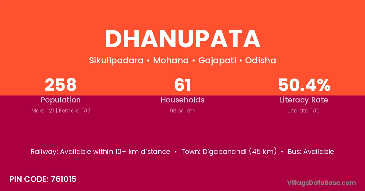 Dhanupata village has a total population of 258 people, of which 121 are males and 137 are females.