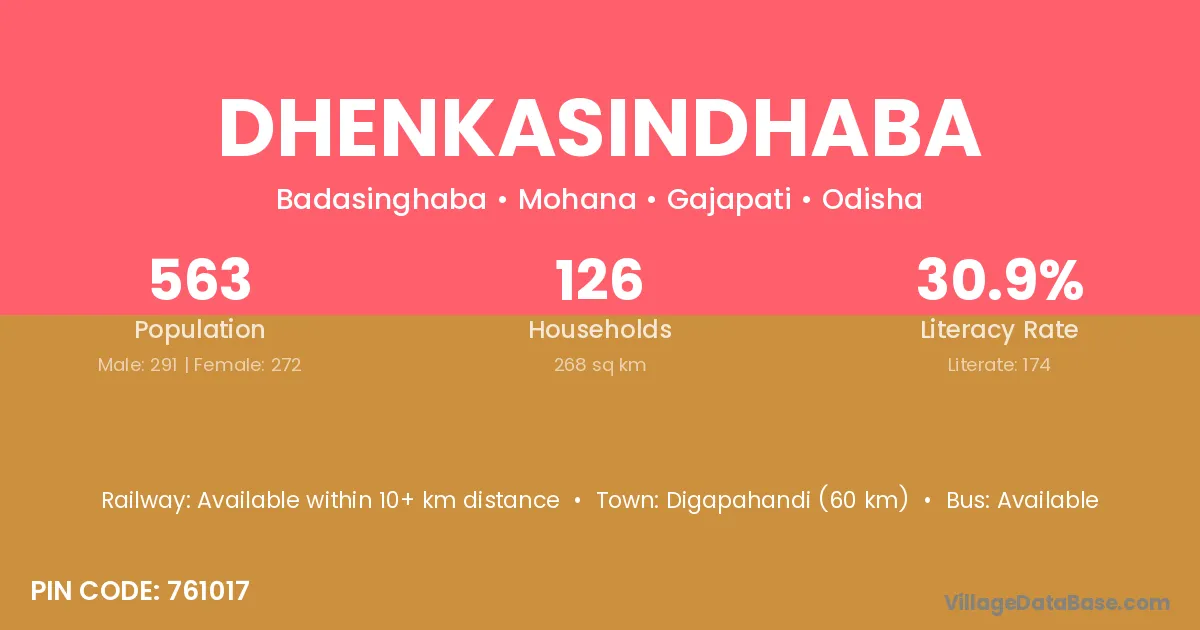 Digapahandi (60 km) is the nearest town to Dhenkasindhaba village for major economic activities and is located approximately 60 km away.