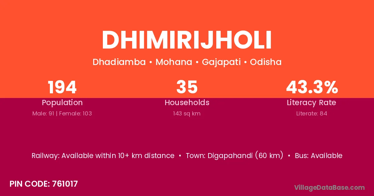 Digapahandi (60 km) is the nearest town to Dhimirijholi village for major economic activities and is located approximately 60 km away.