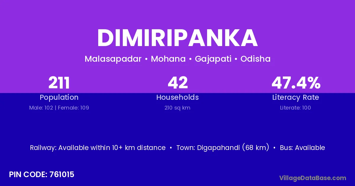 Digapahandi (68 km) is the nearest town to Dimiripanka village for major economic activities and is located approximately 68 km away.