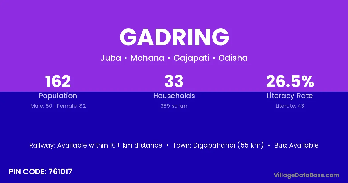 Digapahandi (55 km) is the nearest town to Gadring village for major economic activities and is located approximately 55 km away.