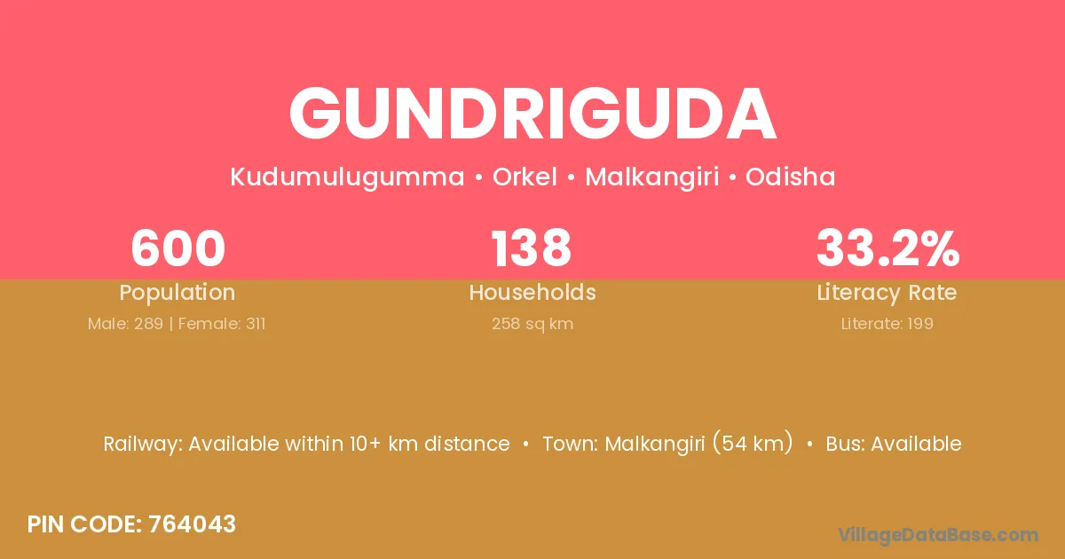 The literacy rate of Gundriguda village is 33.33%. Male literacy stands at 50.00% and female literacy at 15.22%.