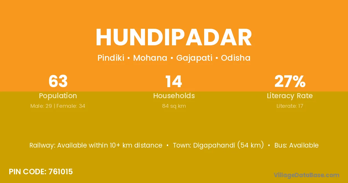 Digapahandi (54 km) is the nearest town to Hundipadar village for major economic activities and is located approximately 54 km away.