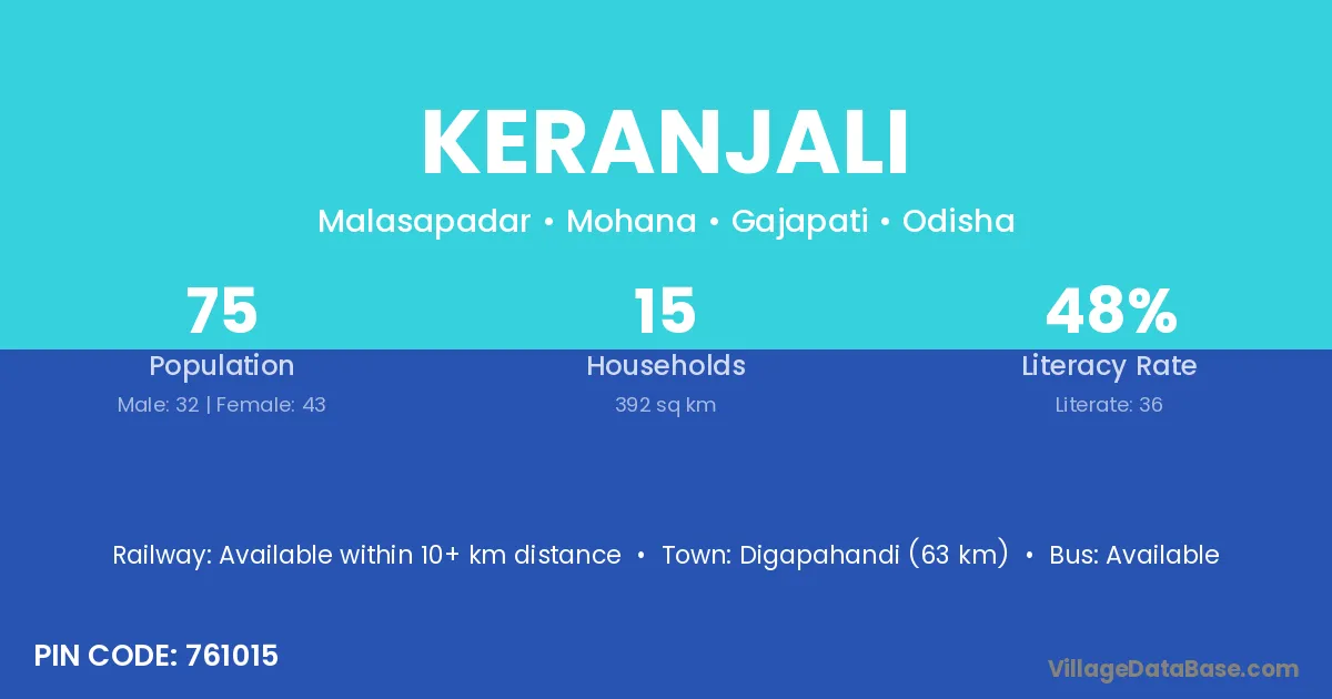 Digapahandi (63 km) is the nearest town to Keranjali village for major economic activities and is located approximately 63 km away.