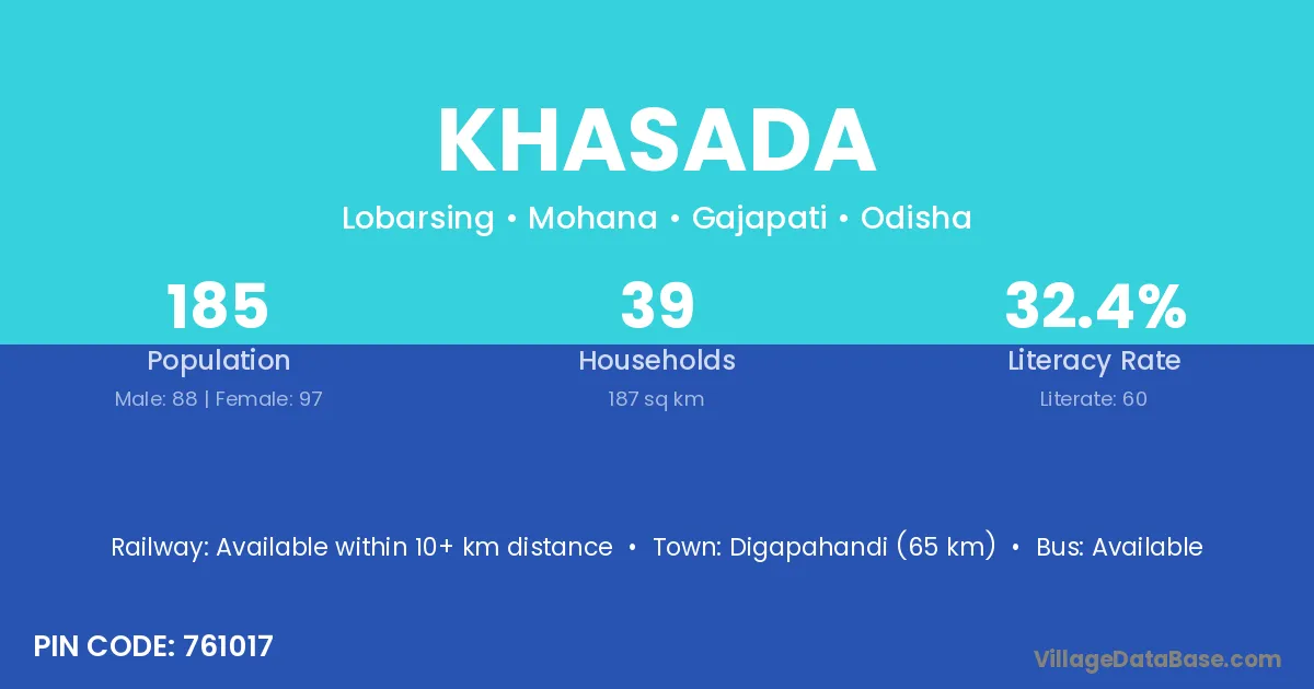 Digapahandi (65 km) is the nearest town to Khasada village for major economic activities and is located approximately 65 km away.