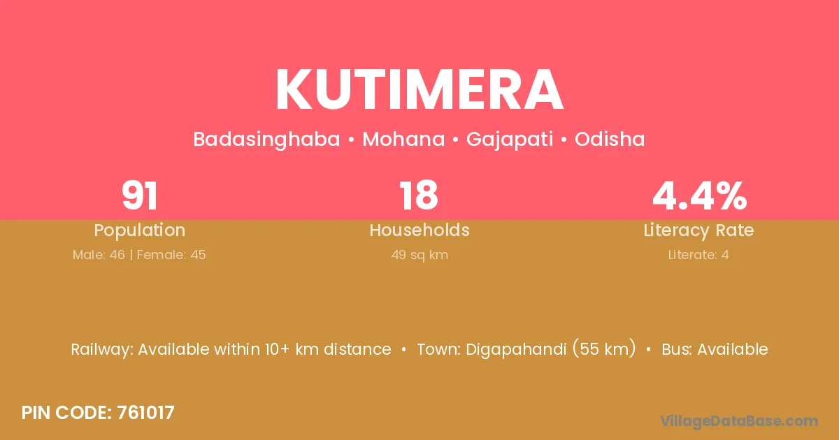 Digapahandi (55 km) is the nearest town to Kutimera village for major economic activities and is located approximately 55 km away.