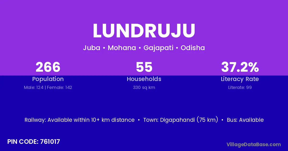 Digapahandi (75 km) is the nearest town to Lundruju village for major economic activities and is located approximately 75 km away.