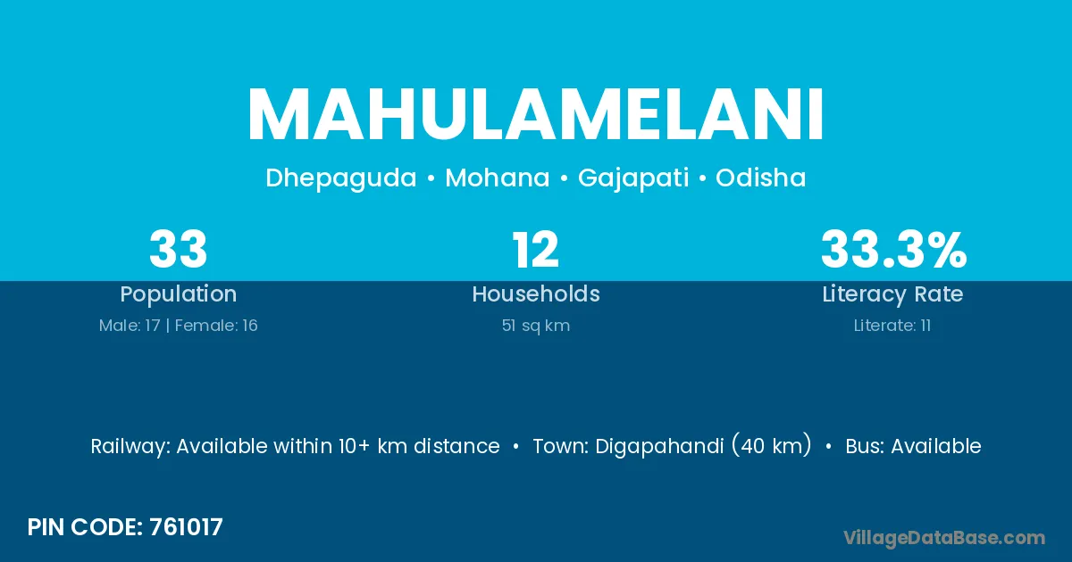 Digapahandi (40 km) is the nearest town to Mahulamelani village for major economic activities and is located approximately 40 km away.
