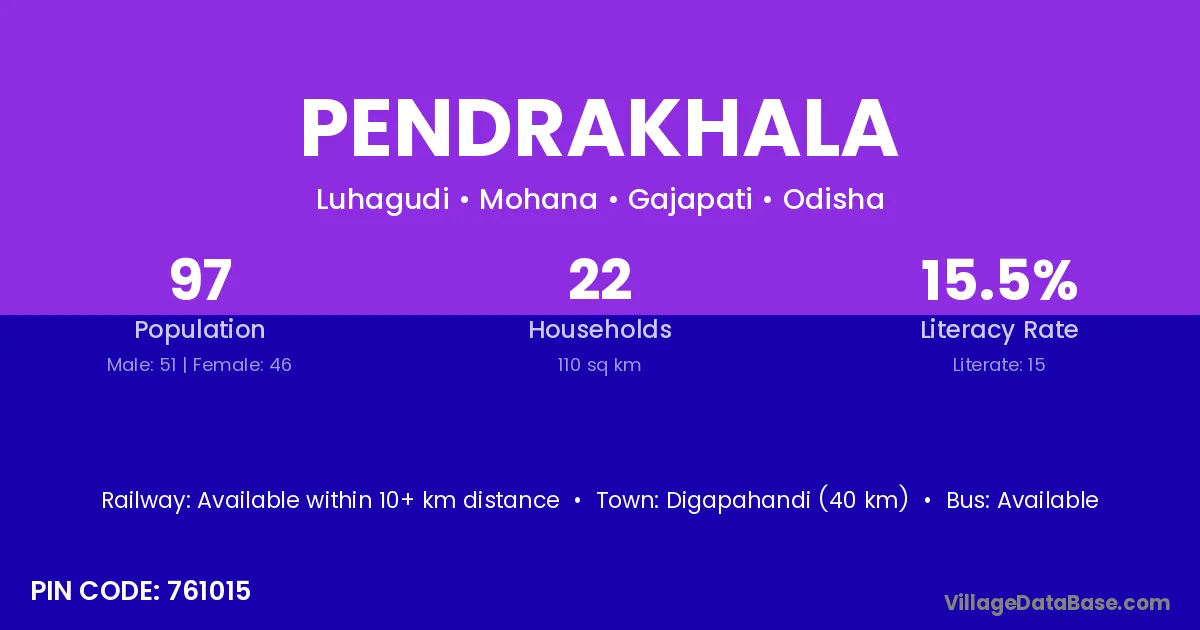 Digapahandi (40 km) is the nearest town to Pendrakhala village for major economic activities and is located approximately 40 km away.