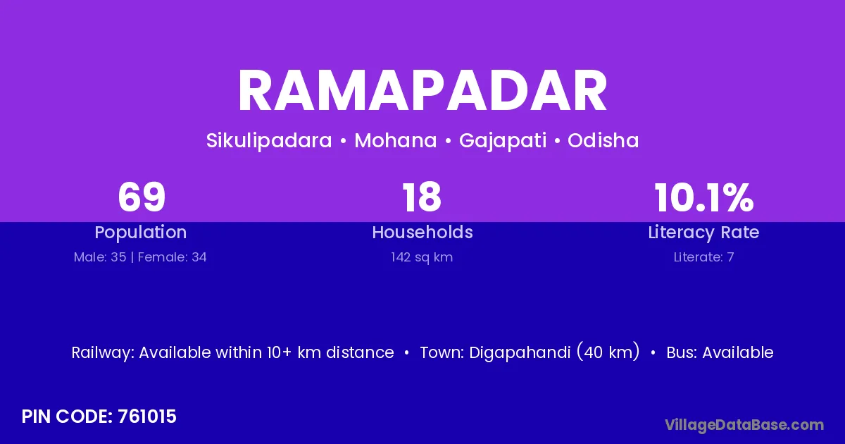 Ramapadar village has a total population of 69 people, of which 35 are males and 34 are females.