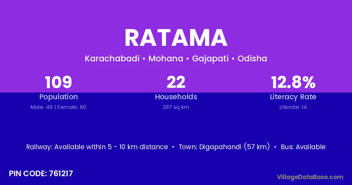 Digapahandi (57 km) is the nearest town to Ratama village for major economic activities and is located approximately 57 km away.