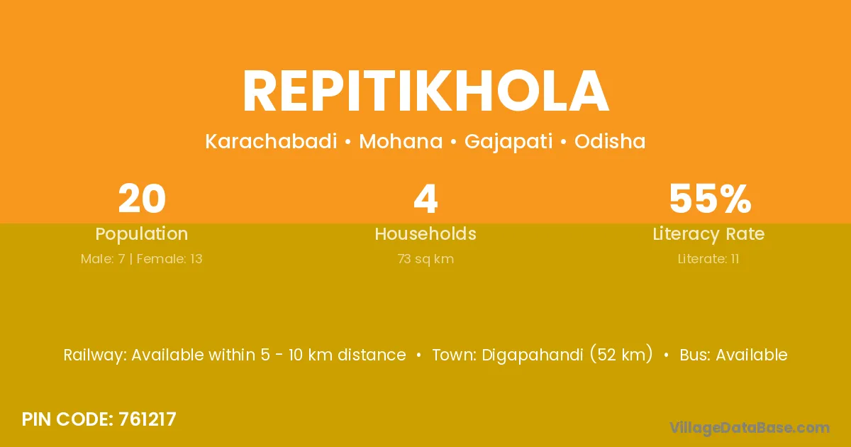 Digapahandi (52 km) is the nearest town to Repitikhola village for major economic activities and is located approximately 52 km away.