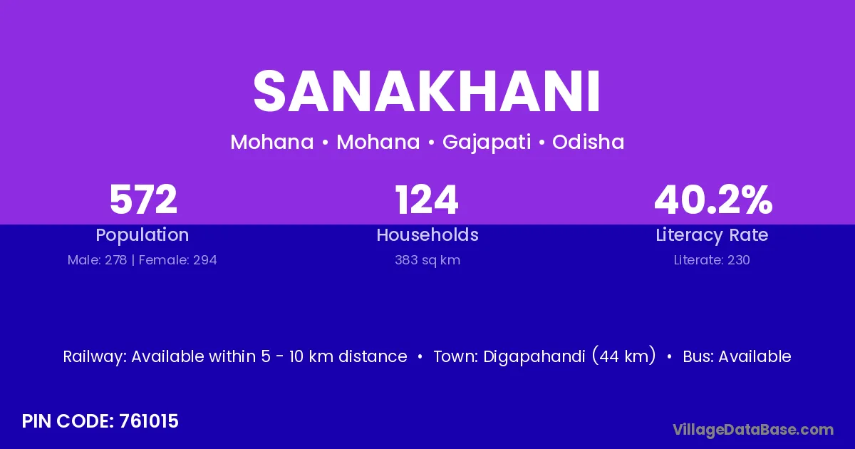 Digapahandi (44 km) is the nearest town to Sanakhani village for major economic activities and is located approximately 44 km away.