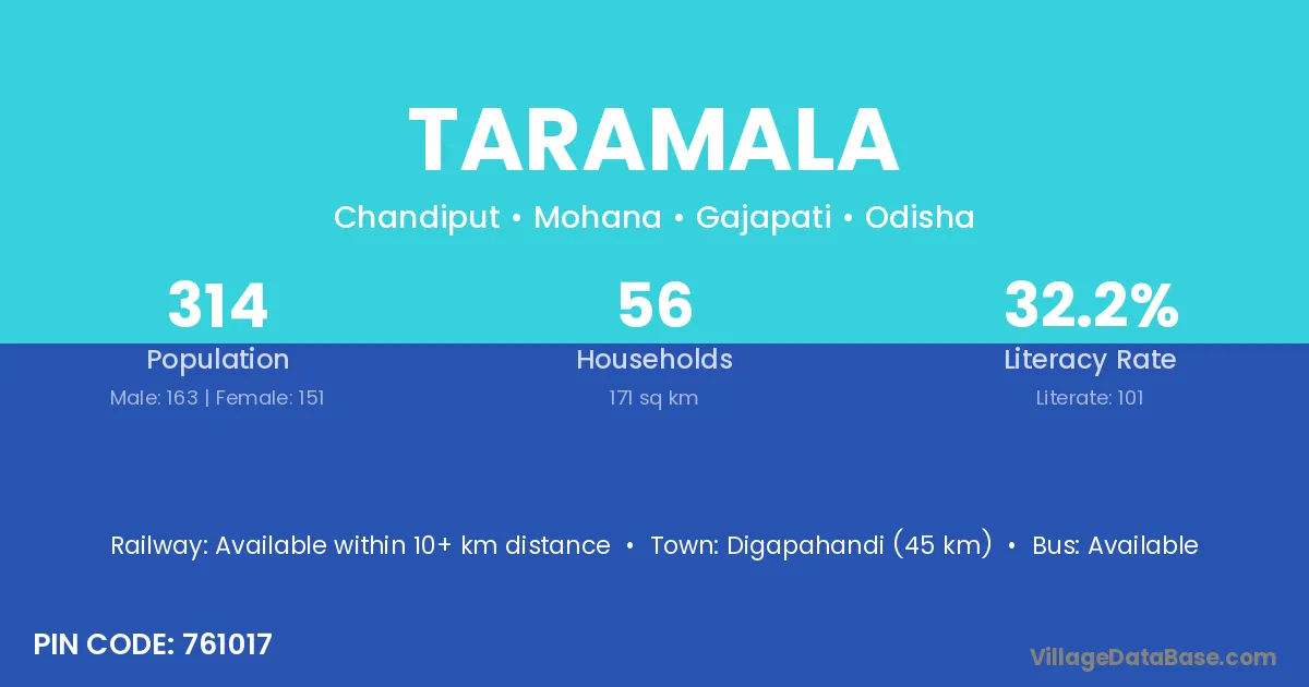 Digapahandi (45 km) is the nearest town to Taramala village for major economic activities and is located approximately 45 km away.