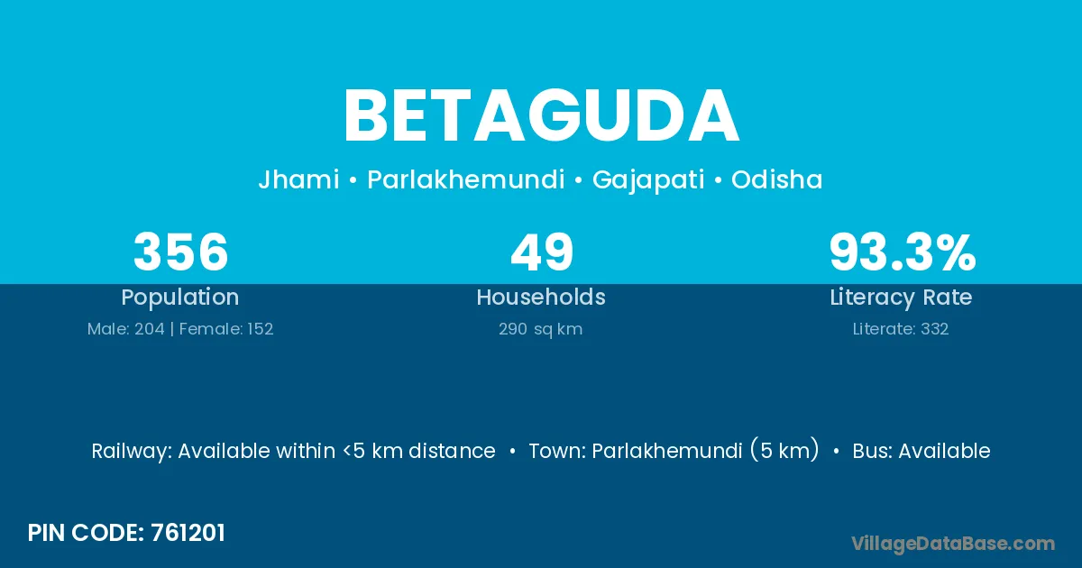 Parlakhemundi (5 km) is the nearest town to Betaguda village for major economic activities and is located approximately 5 km away.
