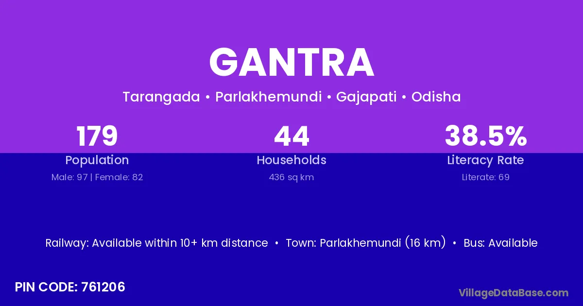 Parlakhemundi (16 km) is the nearest town to Gantra village for major economic activities and is located approximately 16 km away.
