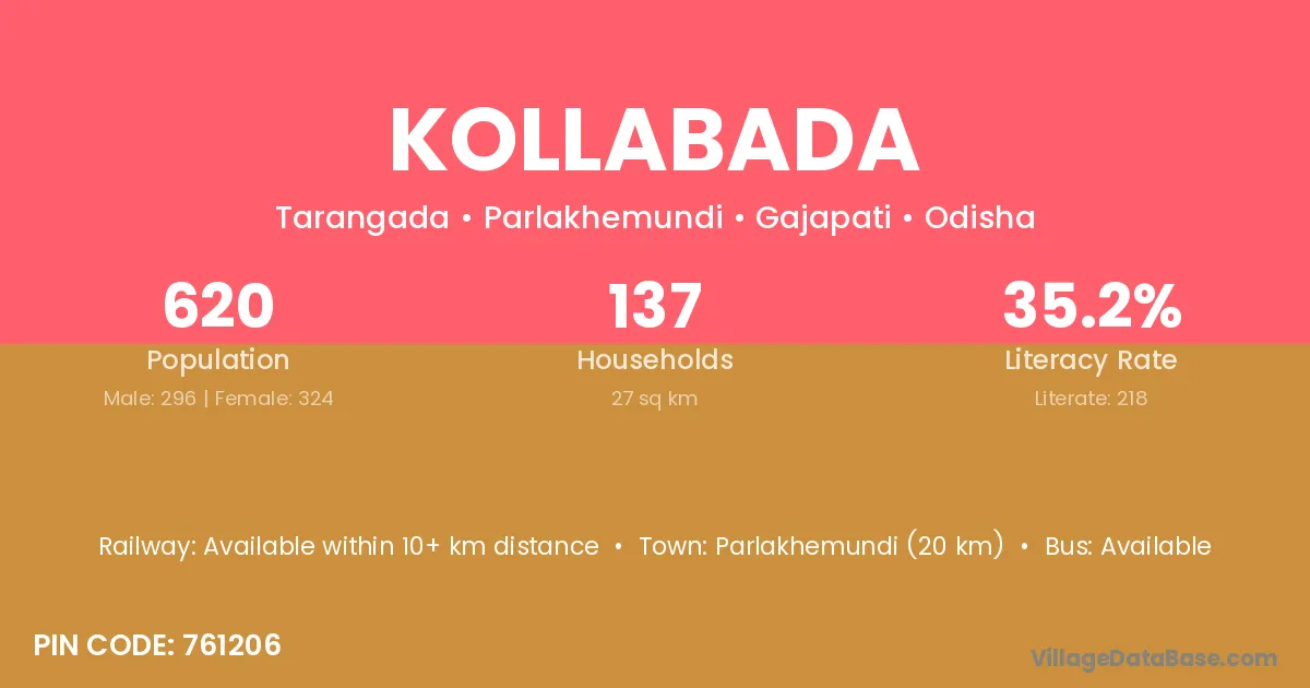 Kollabada village has a total population of 620 people, of which 296 are males and 324 are females.