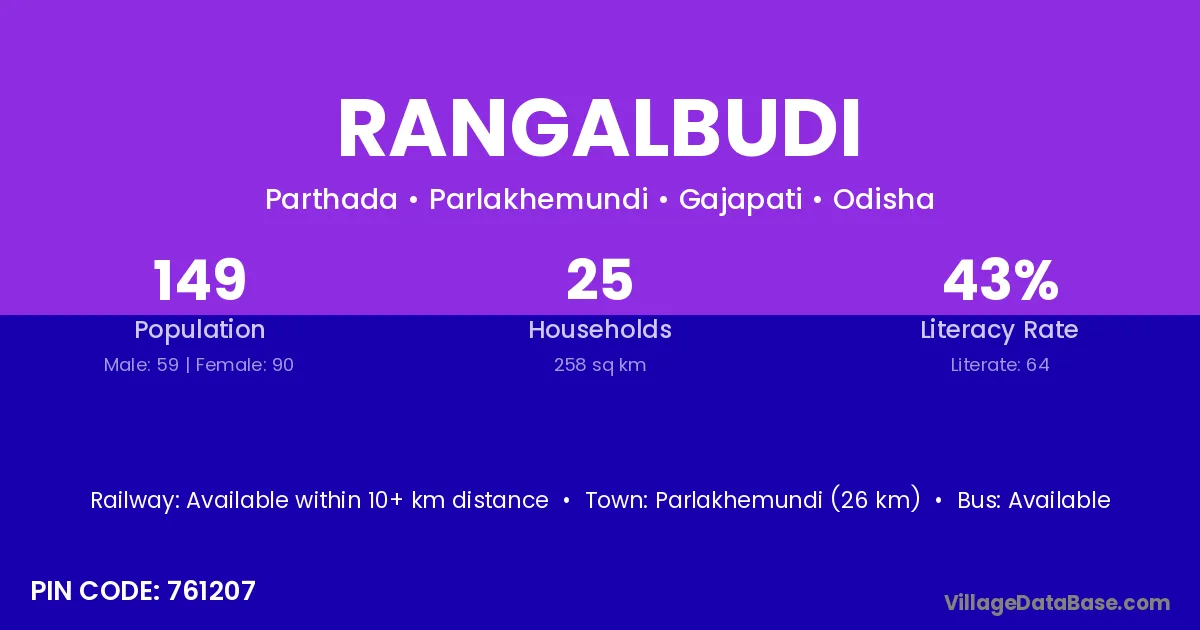 Parlakhemundi (26 km) is the nearest town to Rangalbudi village for major economic activities and is located approximately 26 km away.