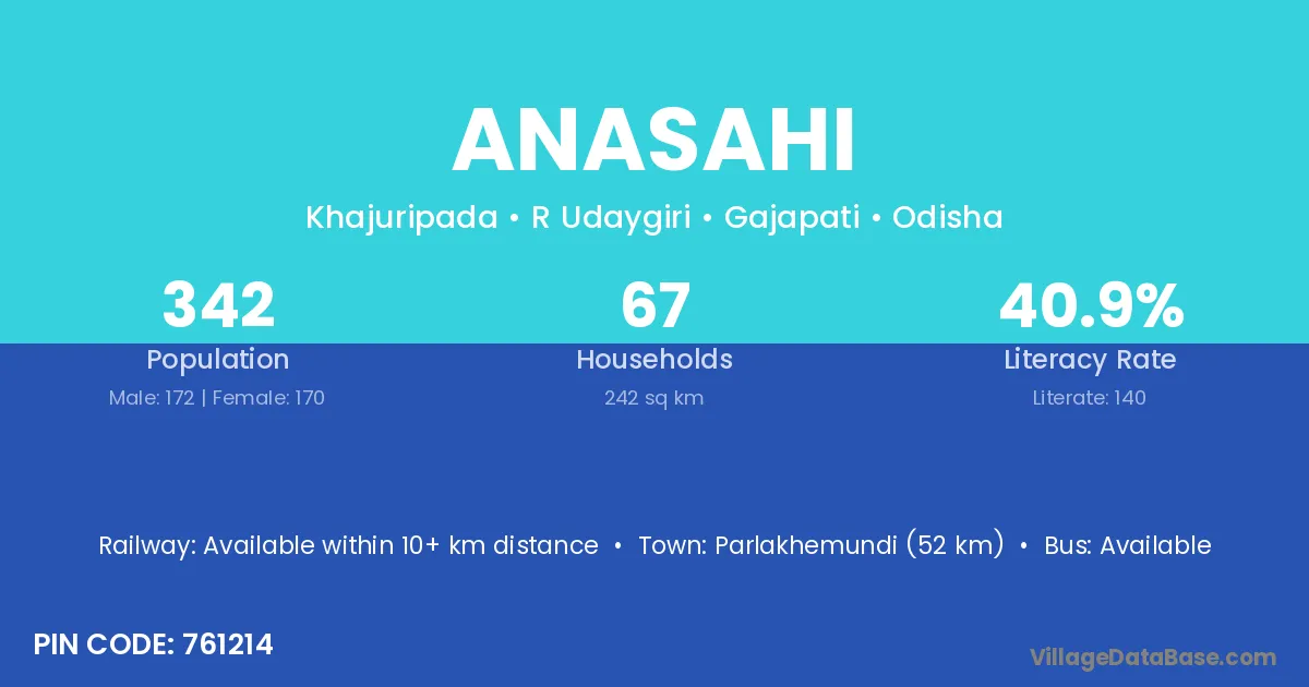 Parlakhemundi (52 km) is the nearest town to Anasahi village for major economic activities and is located approximately 52 km away.
