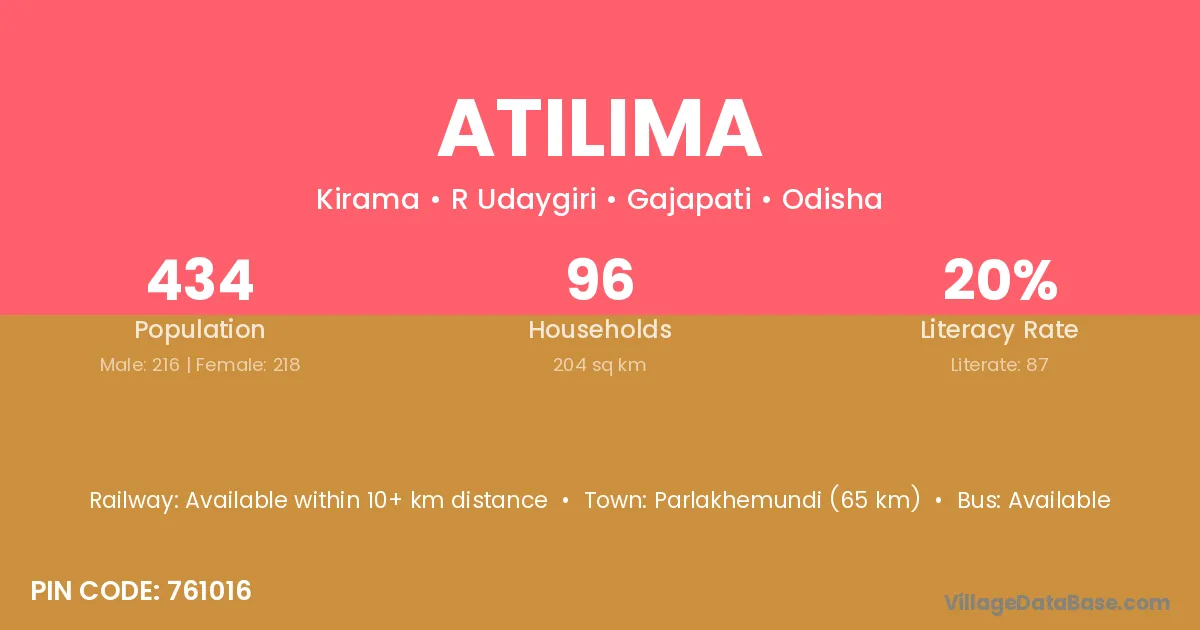 Parlakhemundi (65 km) is the nearest town to Atilima village for major economic activities and is located approximately 65 km away.