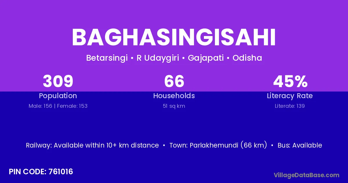 Parlakhemundi (66 km) is the nearest town to Baghasingisahi village for major economic activities and is located approximately 66 km away.