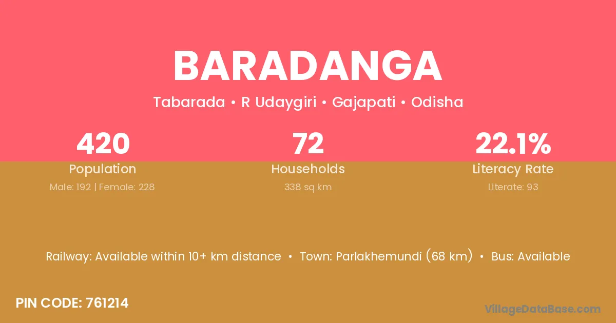 Parlakhemundi (68 km) is the nearest town to Baradanga village for major economic activities and is located approximately 68 km away.
