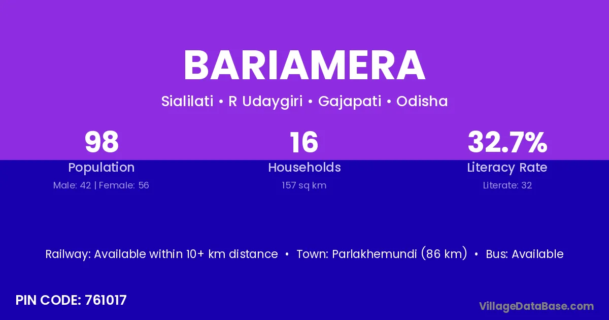 Parlakhemundi (86 km) is the nearest town to Bariamera village for major economic activities and is located approximately 86 km away.