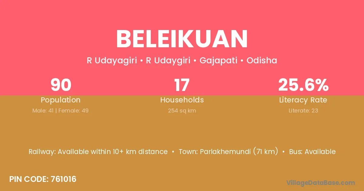 Parlakhemundi (71 km) is the nearest town to Beleikuan village for major economic activities and is located approximately 71 km away.
