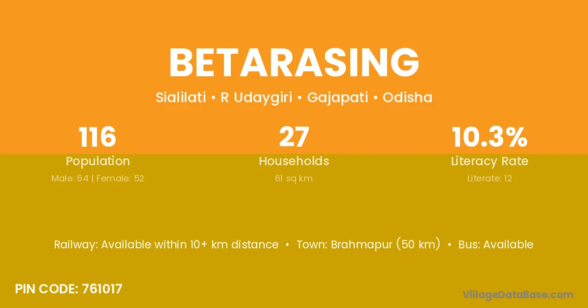 Brahmapur (50 km) is the nearest town to Betarasing village for major economic activities and is located approximately 50 km away.