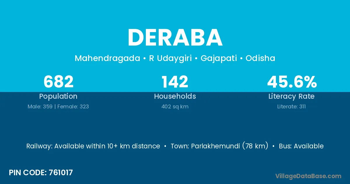 Parlakhemundi (78 km) is the nearest town to Deraba village for major economic activities and is located approximately 78 km away.