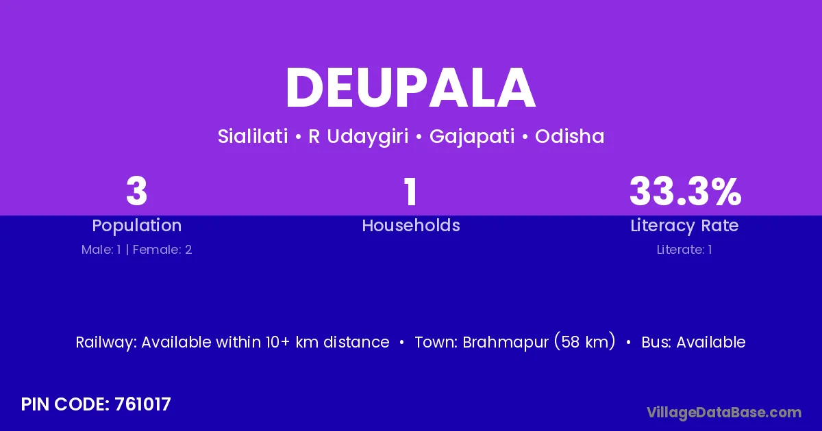 Brahmapur (58 km) is the nearest town to Deupala village for major economic activities and is located approximately 58 km away.
