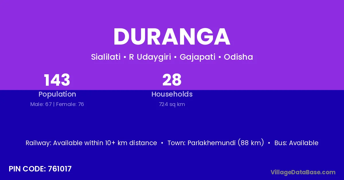 Parlakhemundi (88 km) is the nearest town to Duranga village for major economic activities and is located approximately 88 km away.